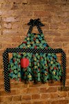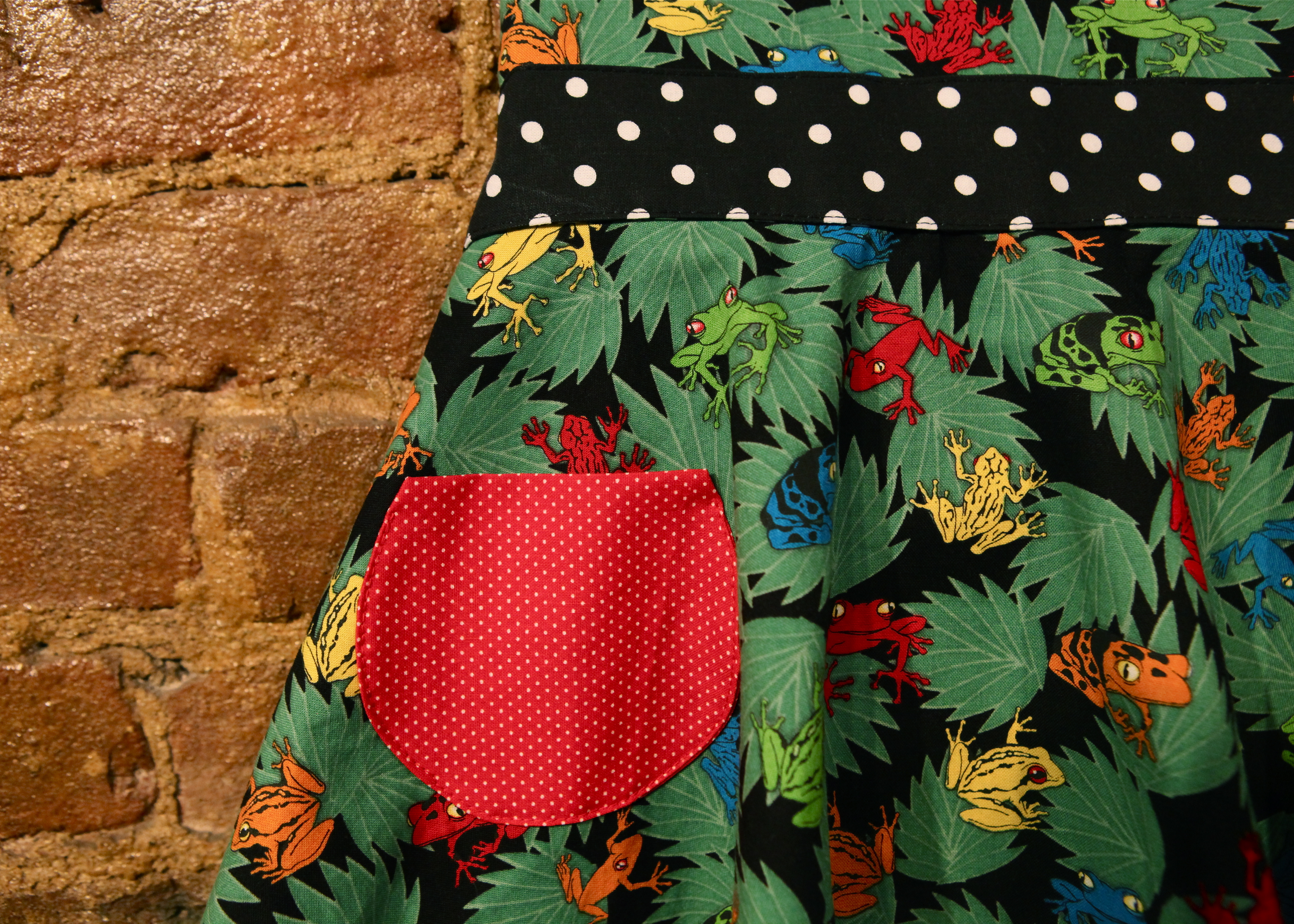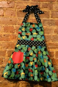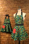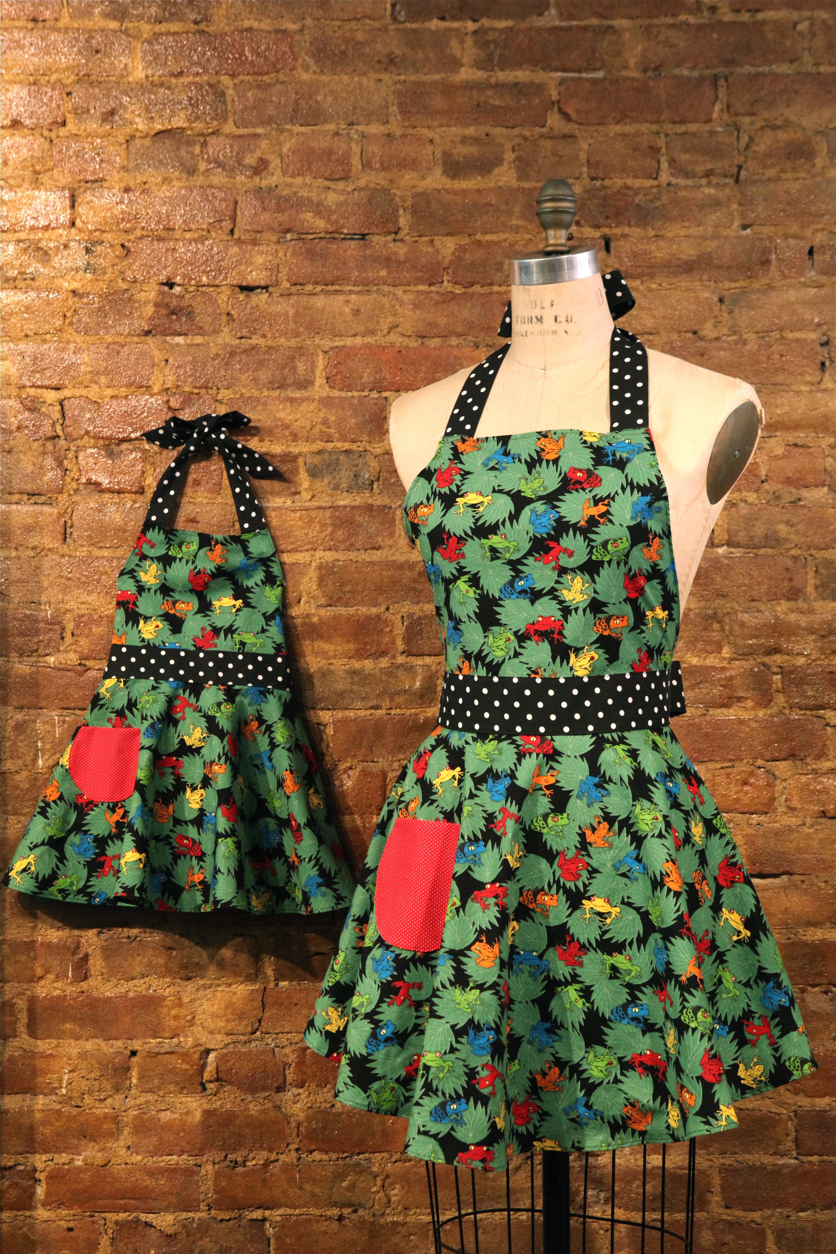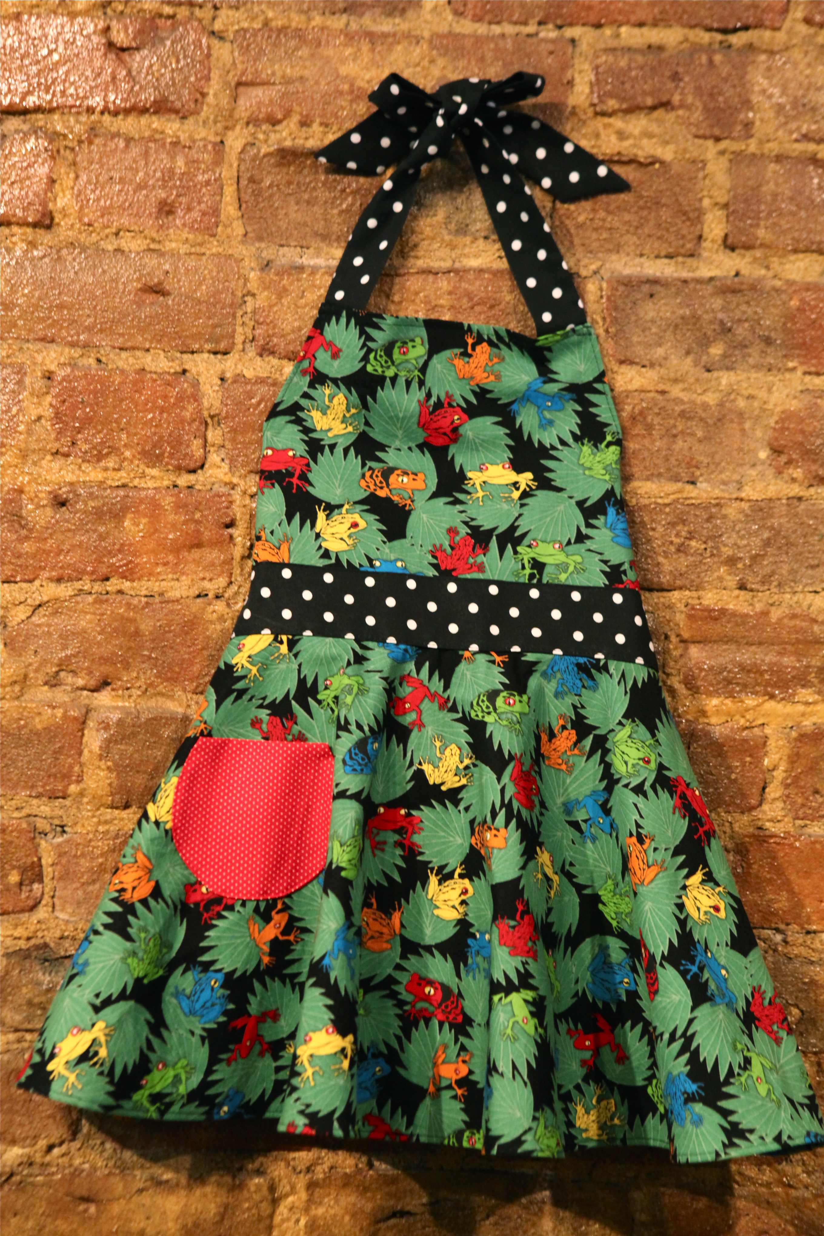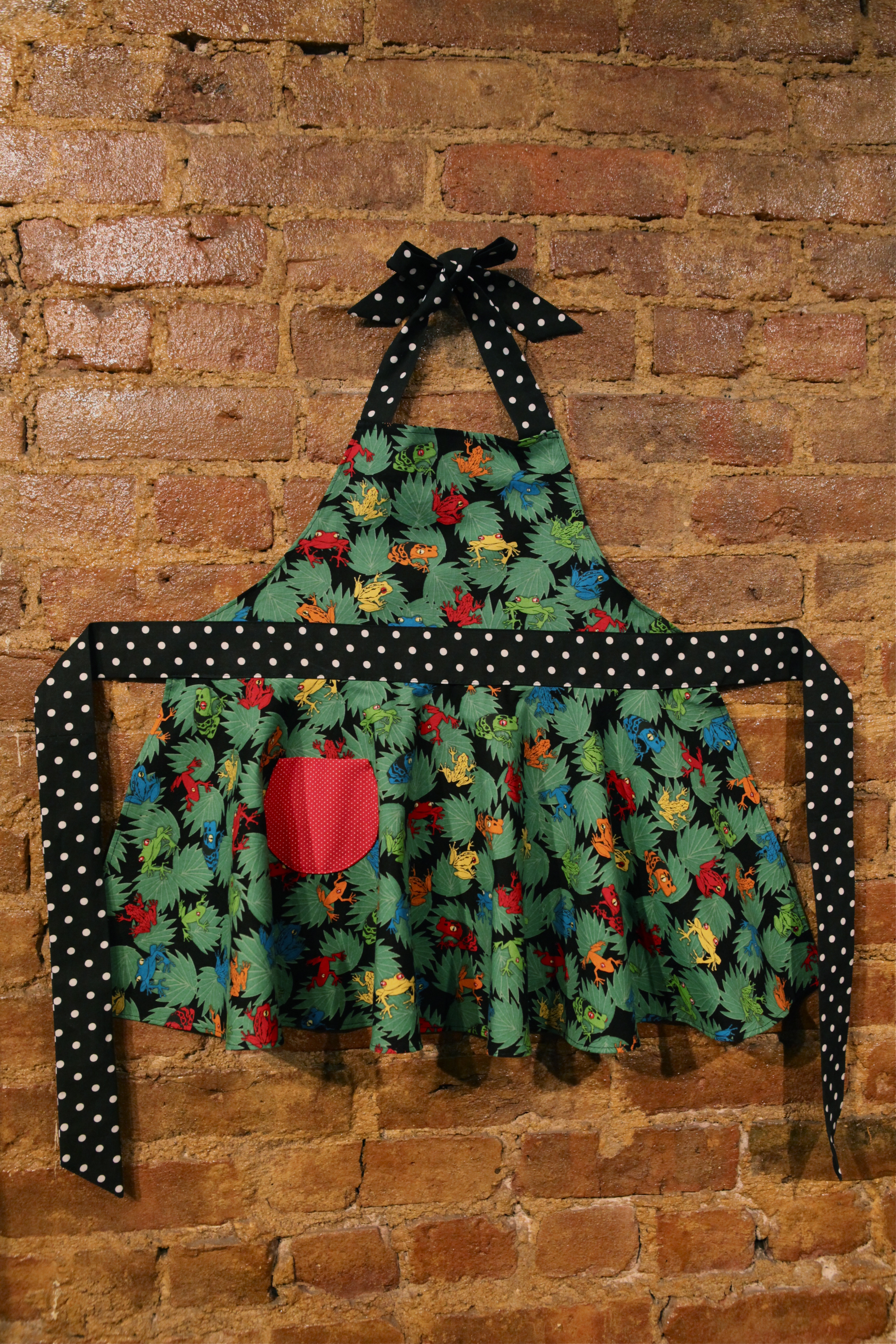 Fanciful frogs for a fun little food fanatic! This child’s circle apron has a colorful frog background with black & white polka-dot sashes and a red polka pocket. The daughter apron matches the mother apron – buy them both and you get a discount! Fits children approximately 5-10.