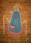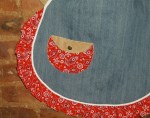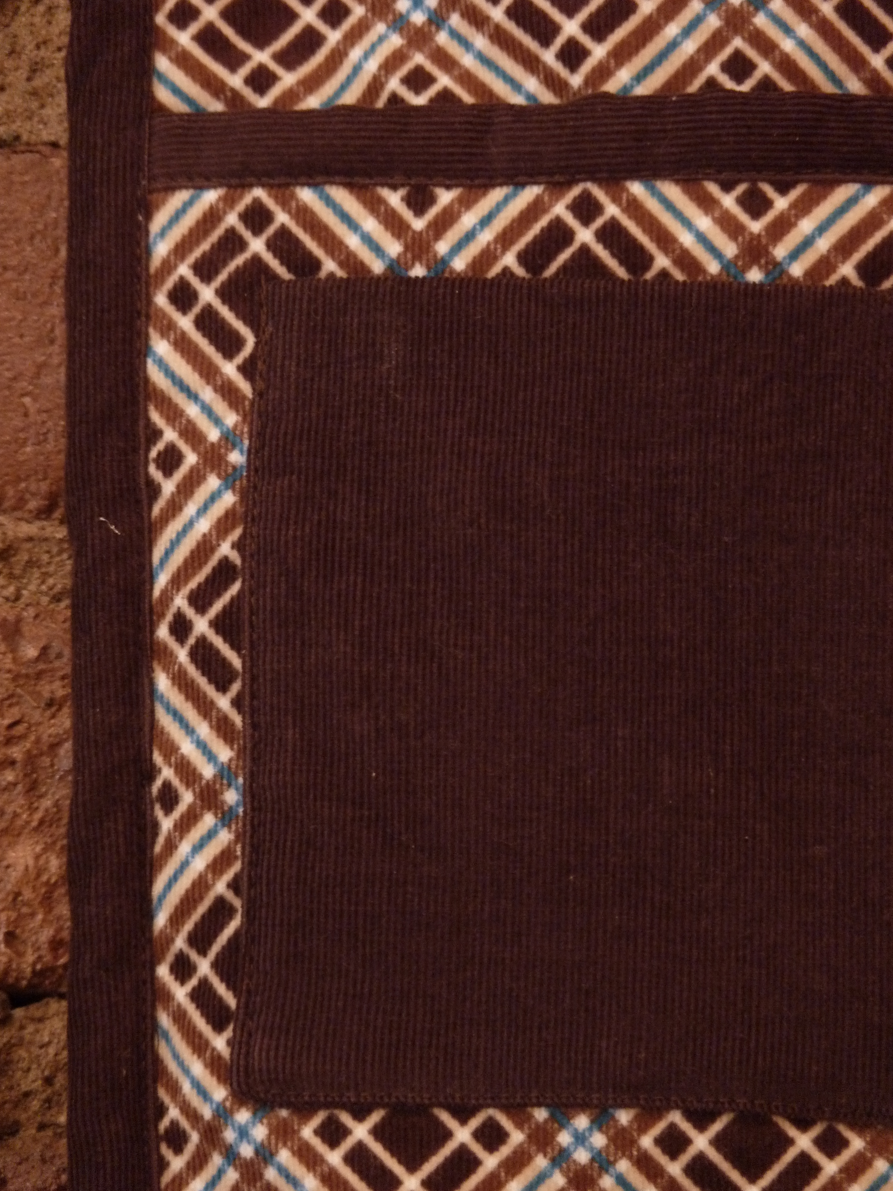 Side two is made from brown corduroy.  The trim, including pockets and loop, is from K & M’s old bedsheets.  (Not shown are two matching hot mitts.)