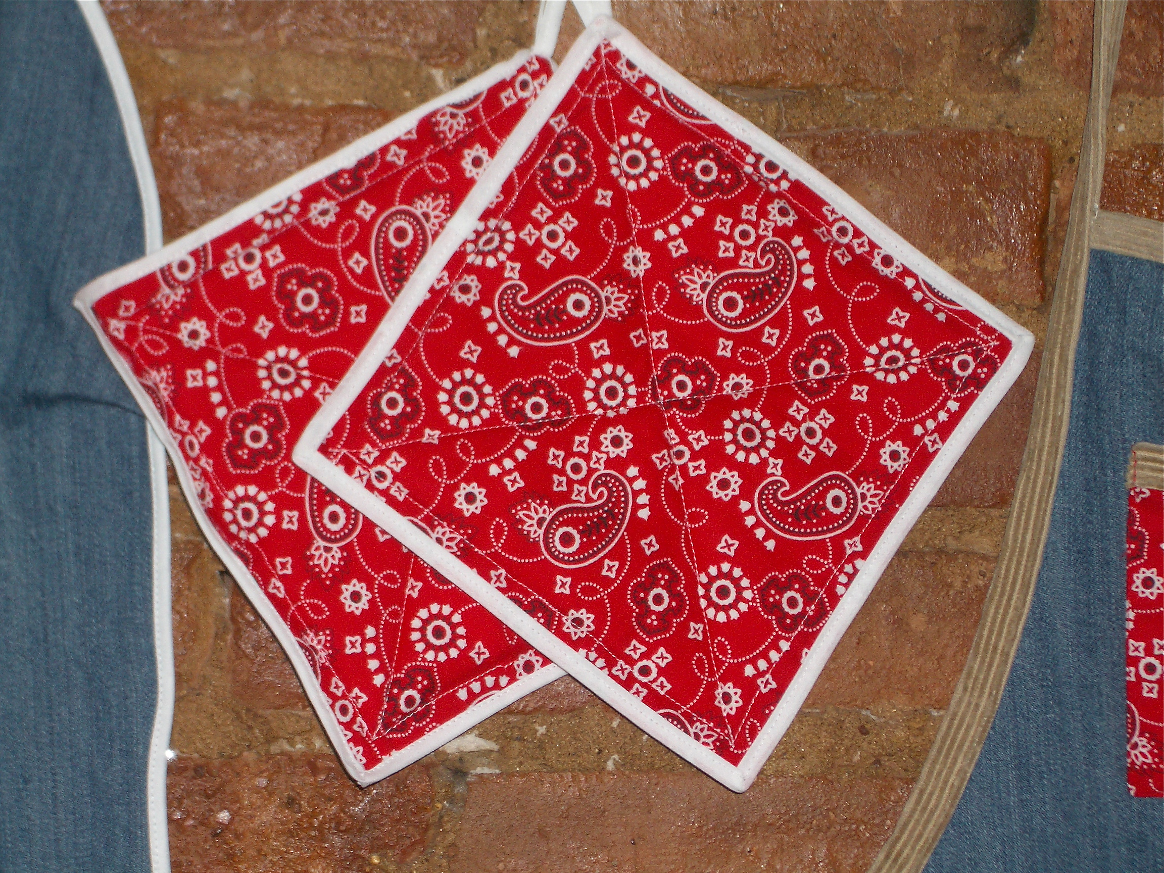 Two bandanna hot mits accompany the aprons.