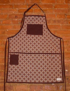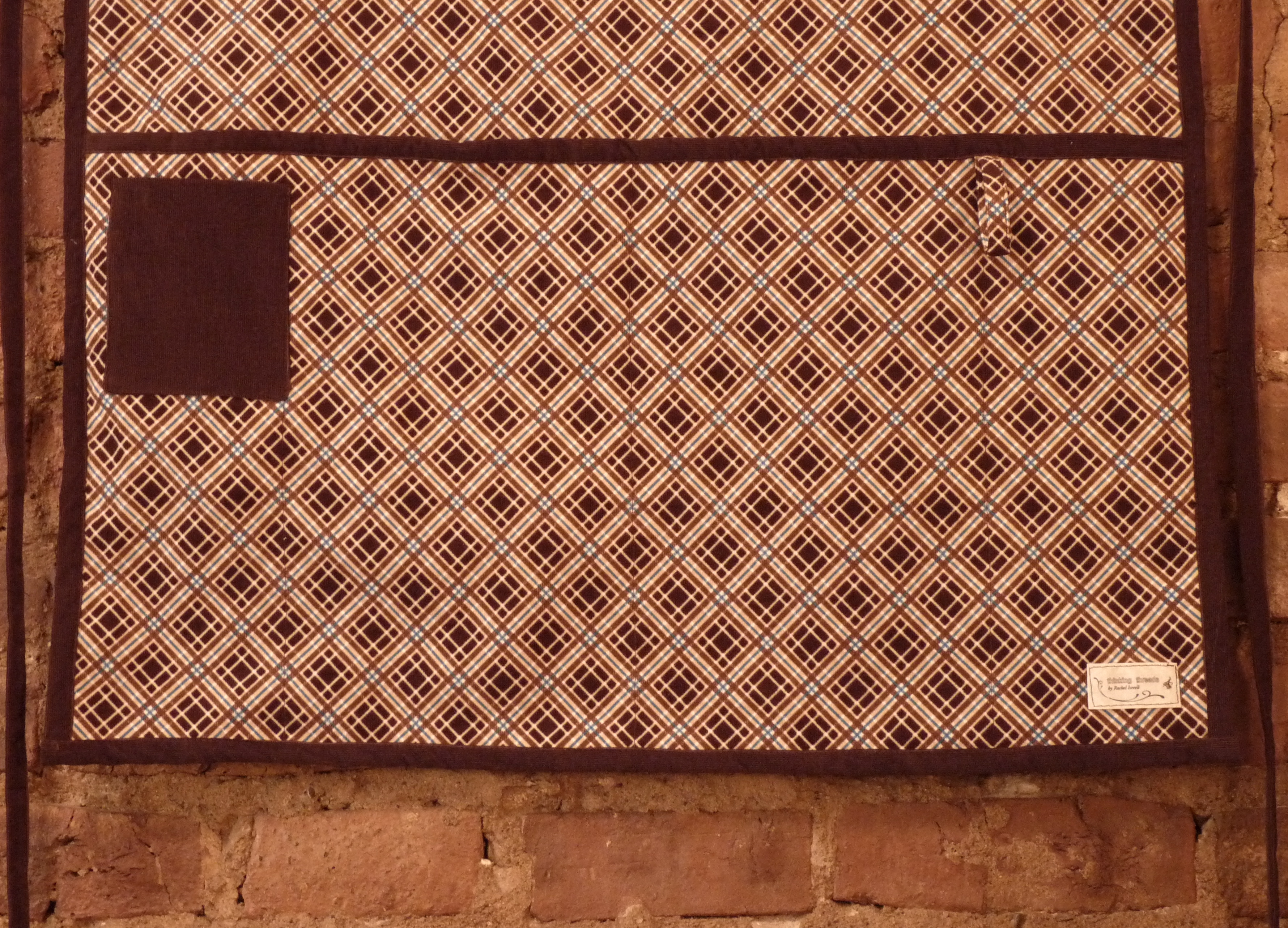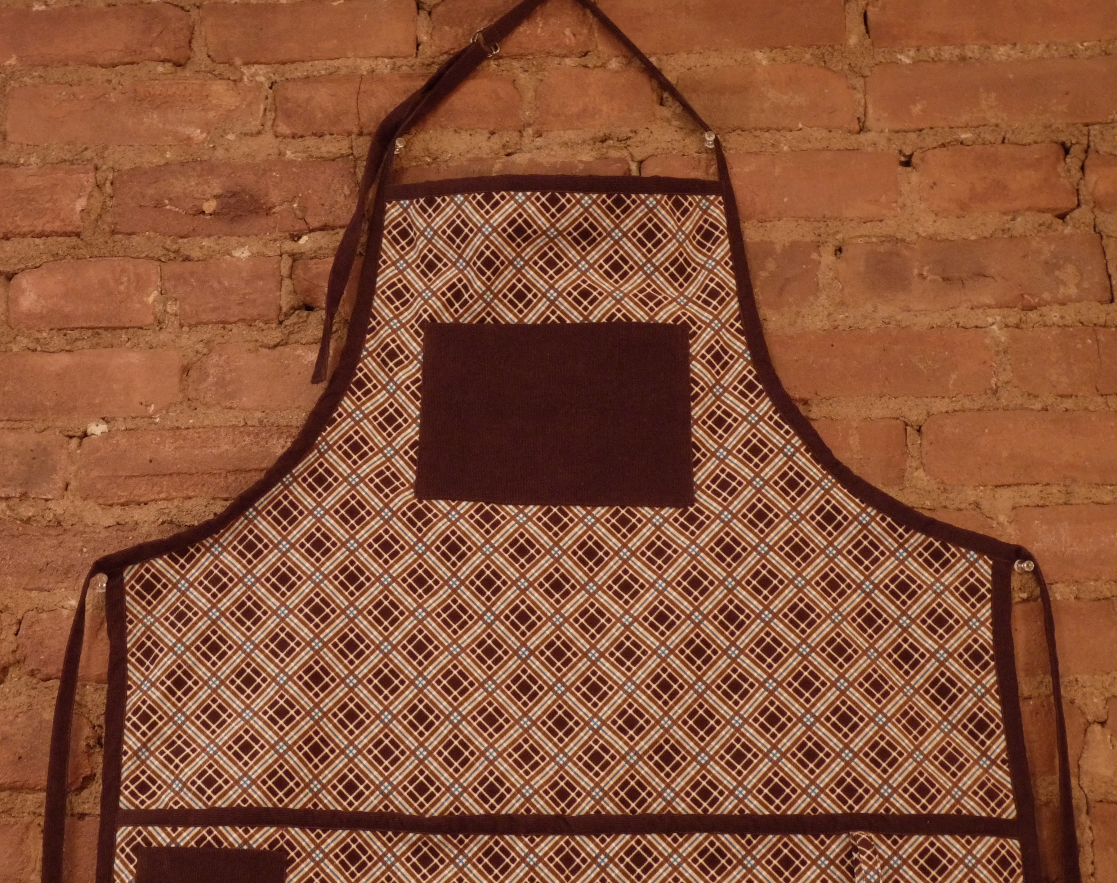 Side one of this reversible apron is made from brown & blue plaid corduroy, trimmed with brown corduroy.  The apron has 4 deep hand or tool pockets, a brown chest pocket and a brown cellphone pocket.  A plaid loop on the waistband can be used for hanging dish towels.