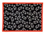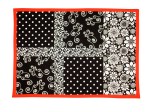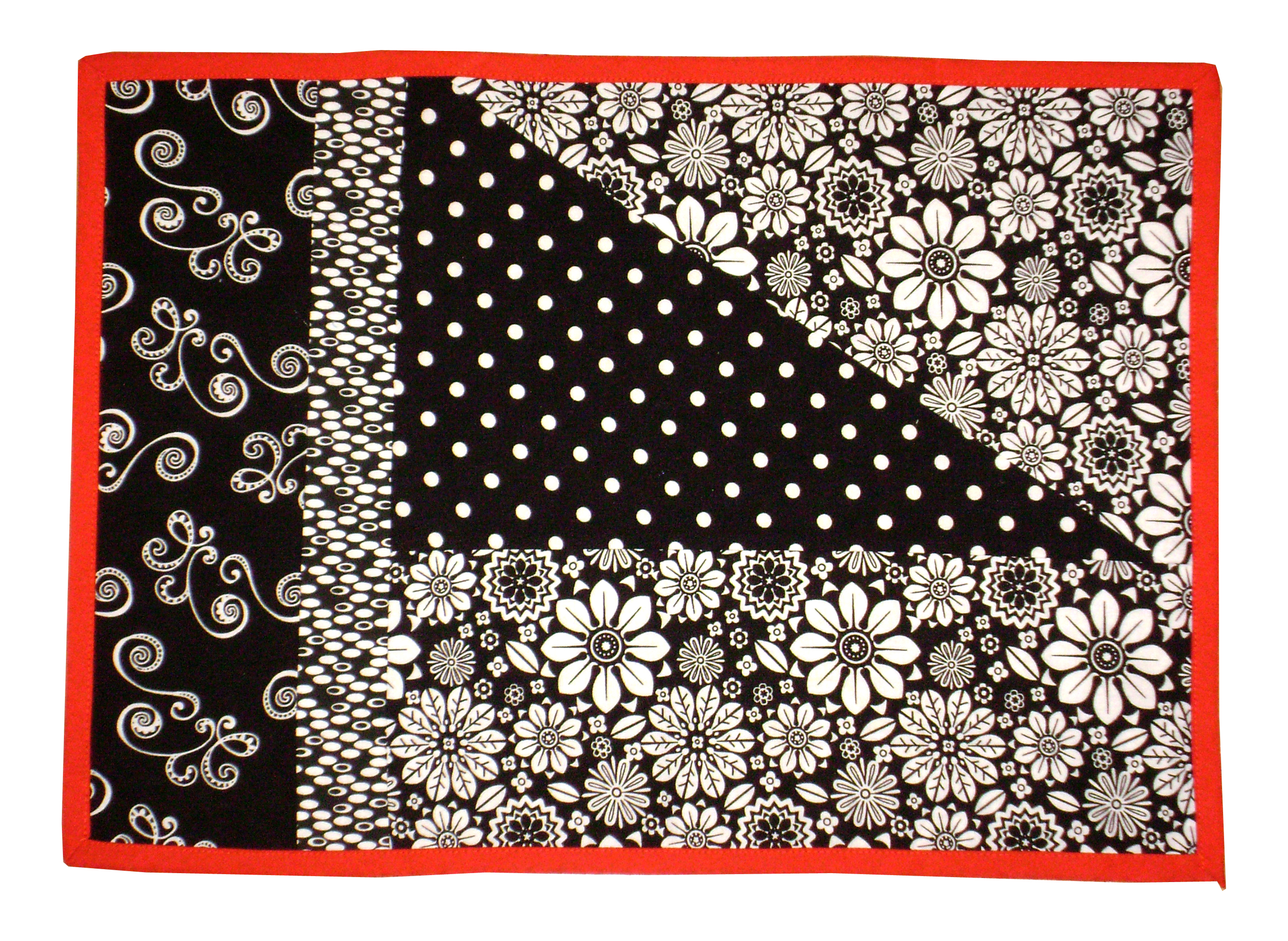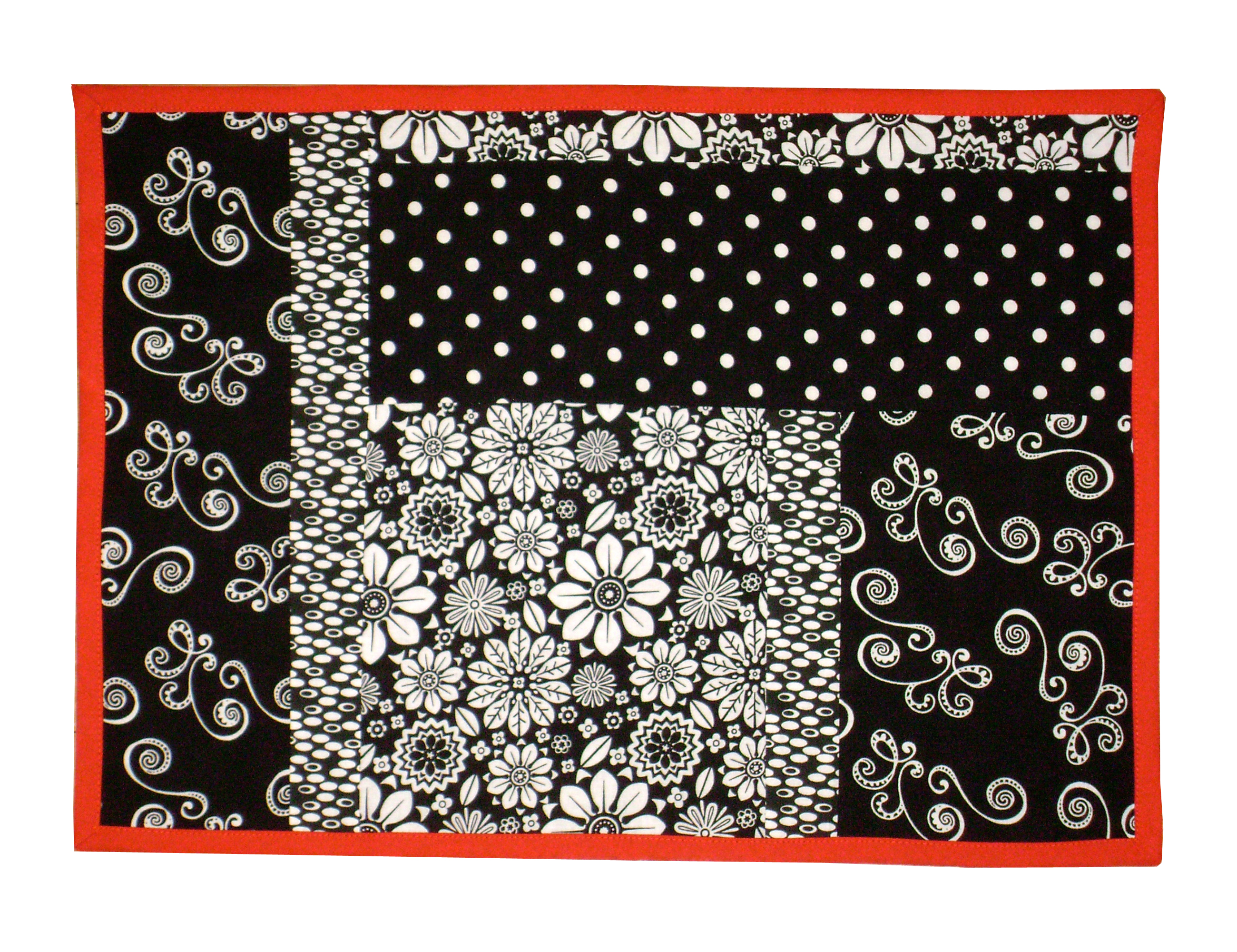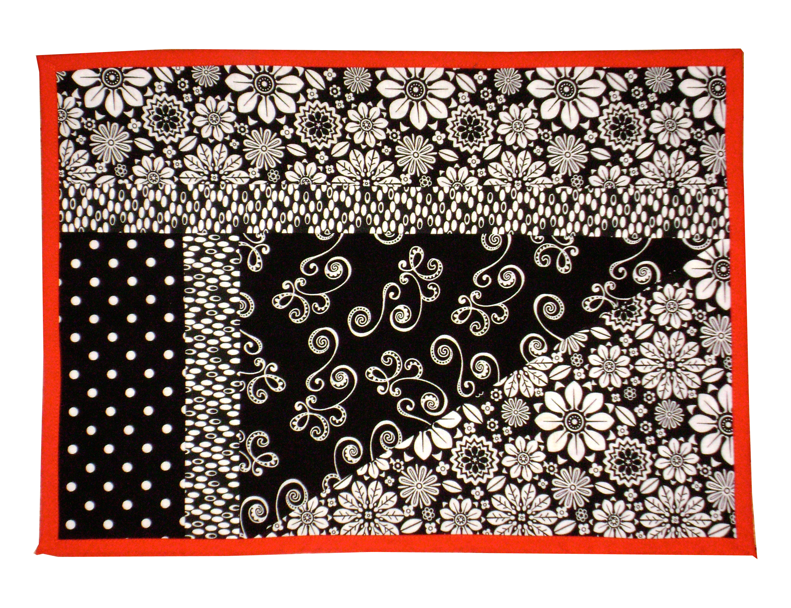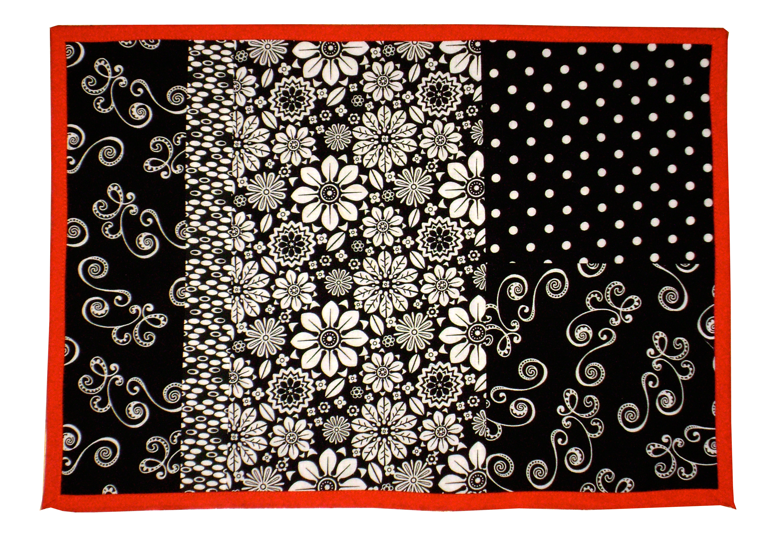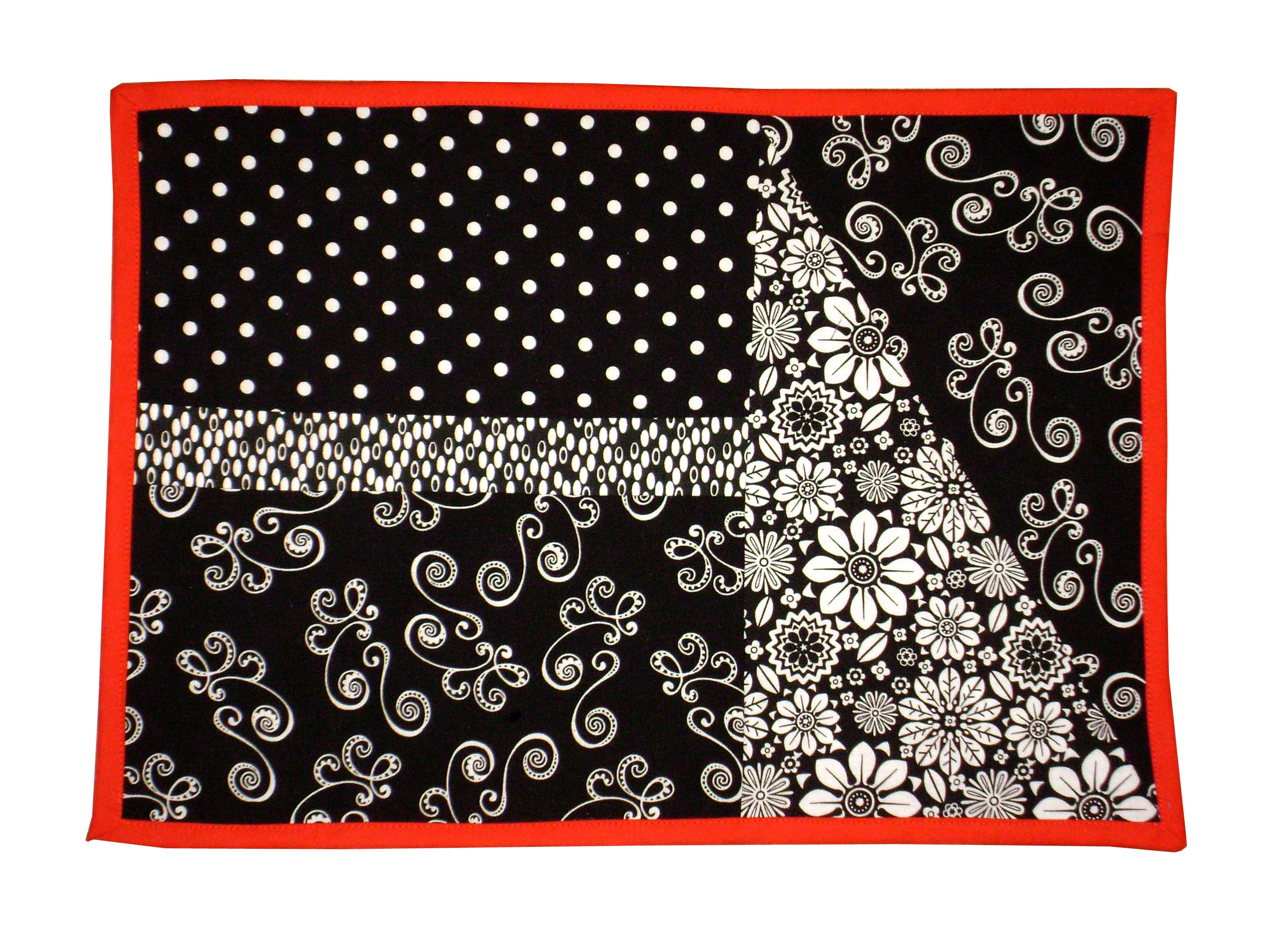 This set of six placemats and napkins are uniquely and carefully composed of four black and white fabrics. All placemats are 18″ x 13″, trimmed in red, and reversible to the swirl pattern shown below.