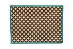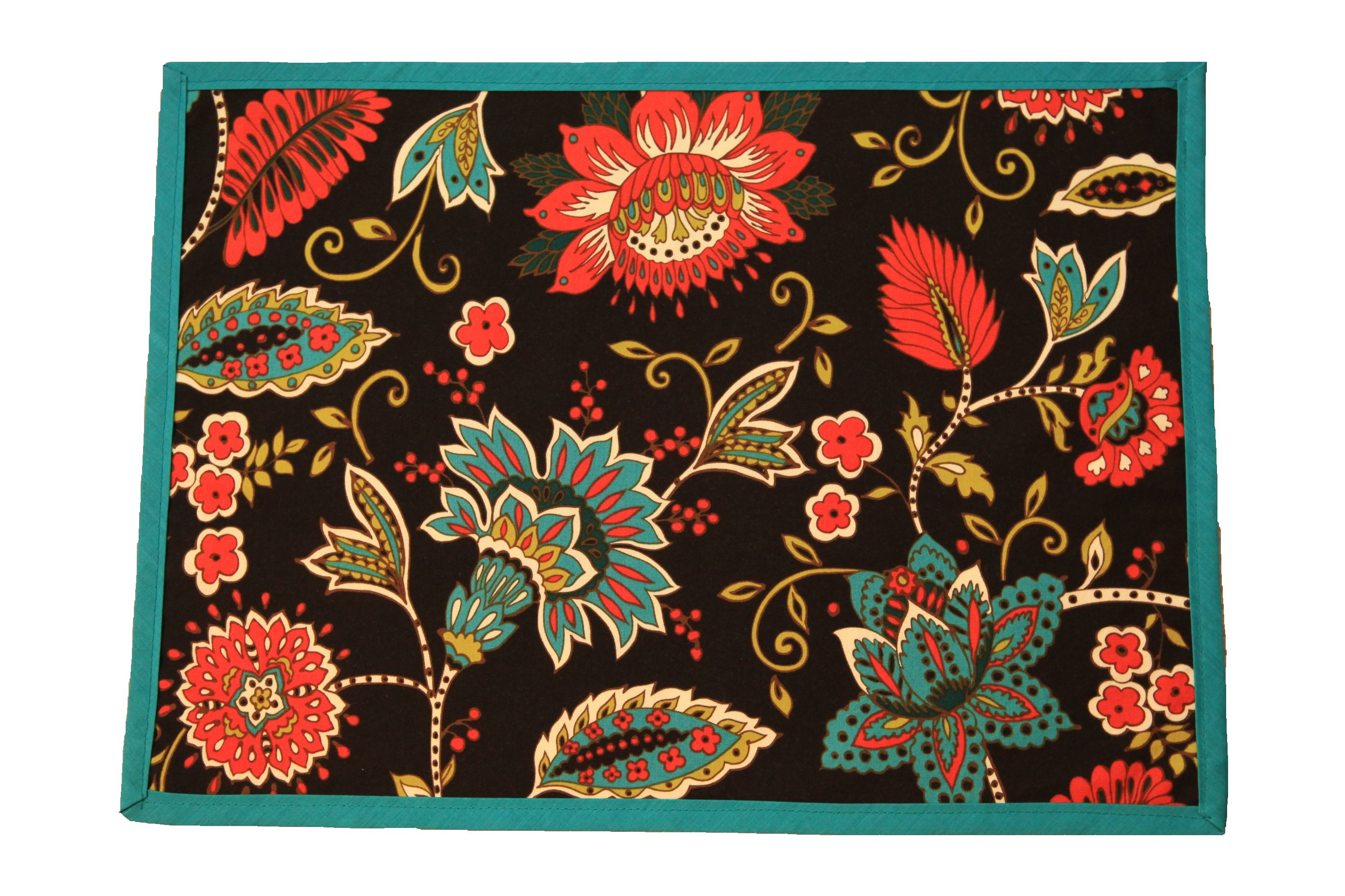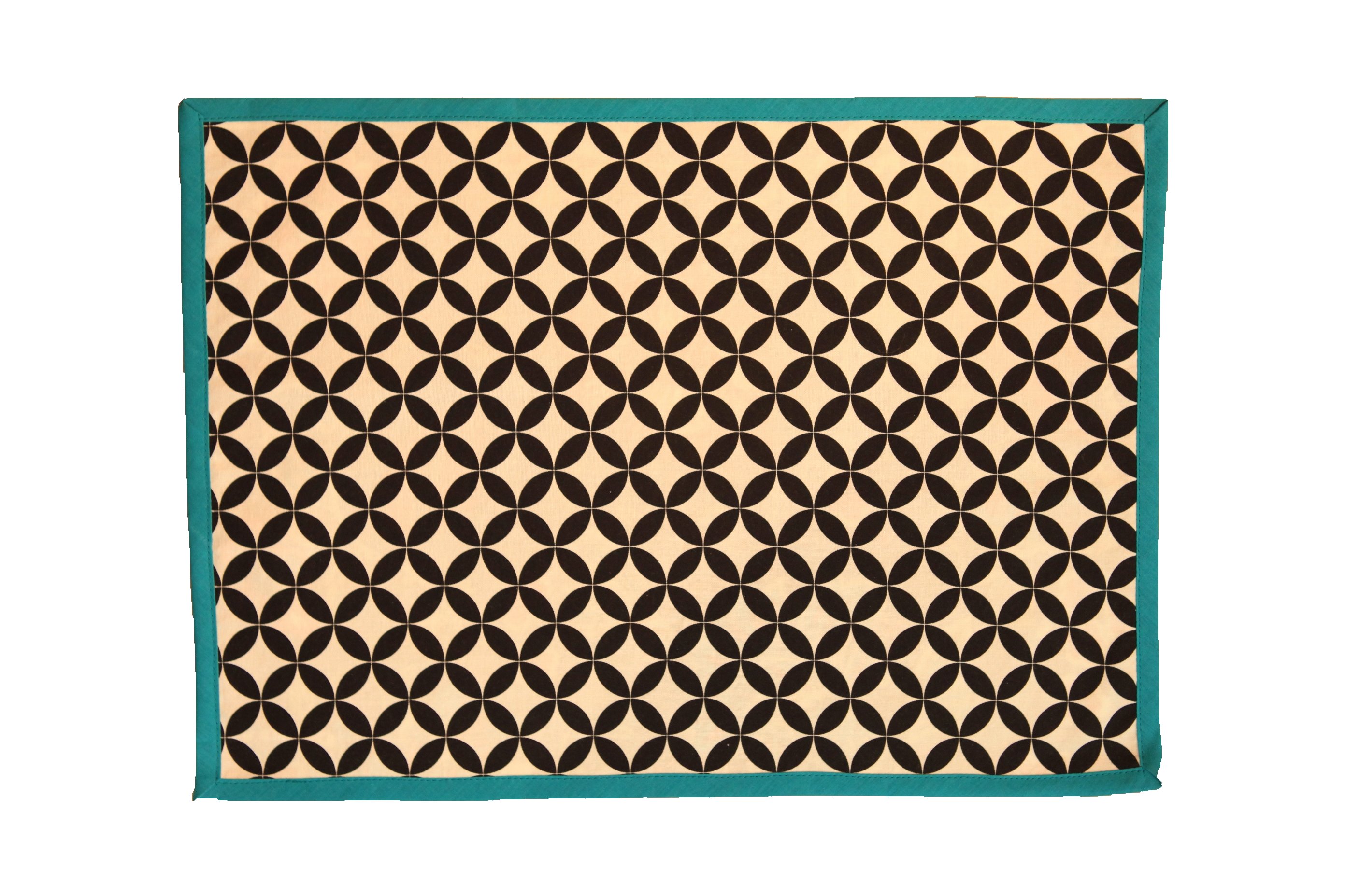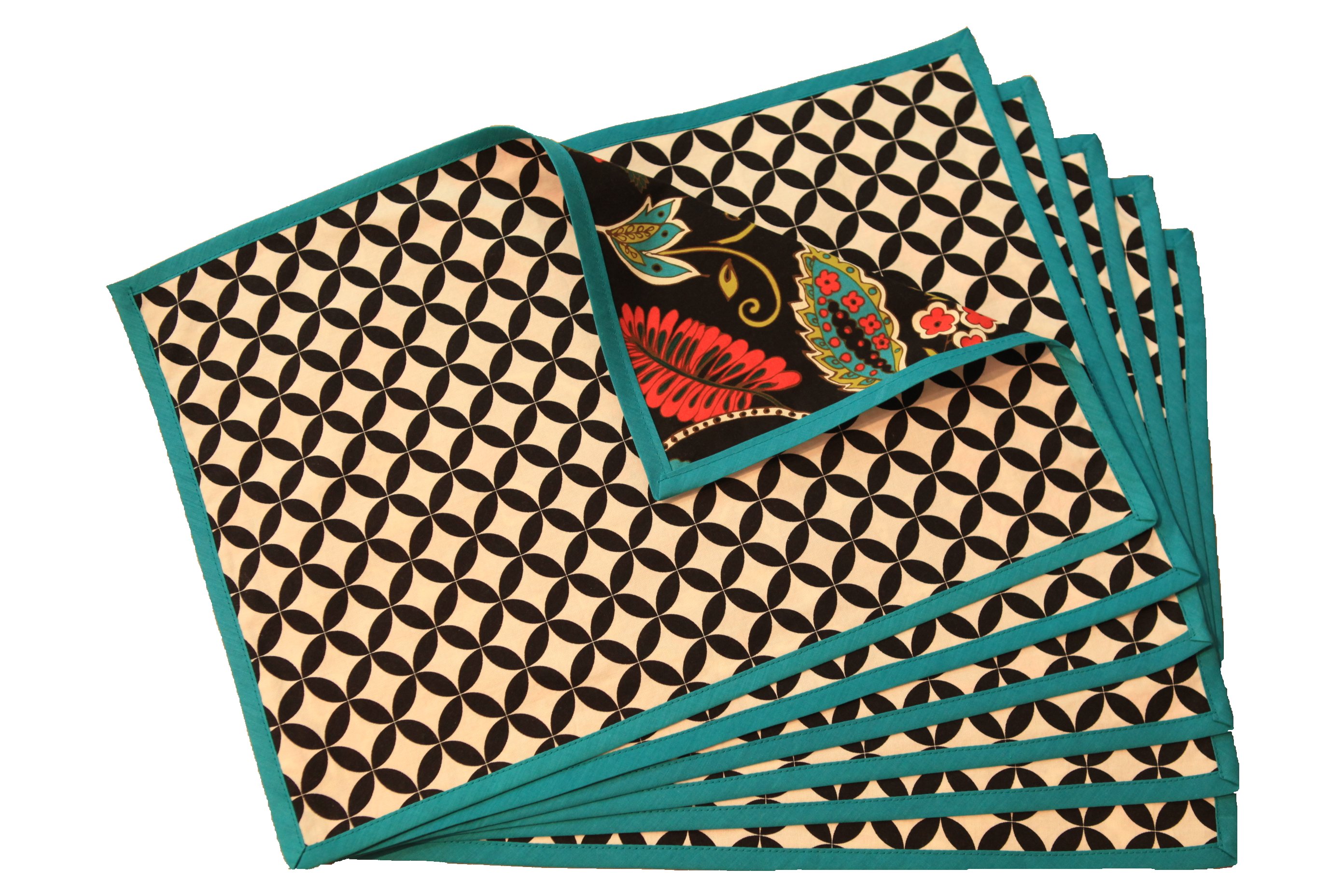 Set of six reversible placemats: Trimmed in turquoise, each 18″ x 13″ placemat has black floral fabric on one side and geometric white-and-black on the reverse.